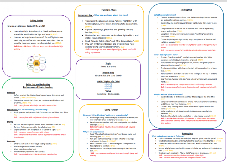 What makes things sparkle? (MA) Why is giving and receiving presents important? (KH, MA) What happens in Winter? (MH) What an we learn about the stars? (LM-G) How does Father Christmas’ sleigh move? (NR) Can we learn to sing Christmas songs? (TB-W) Where does light come from? (IH) Why do we have lights at Christmas? (LC)