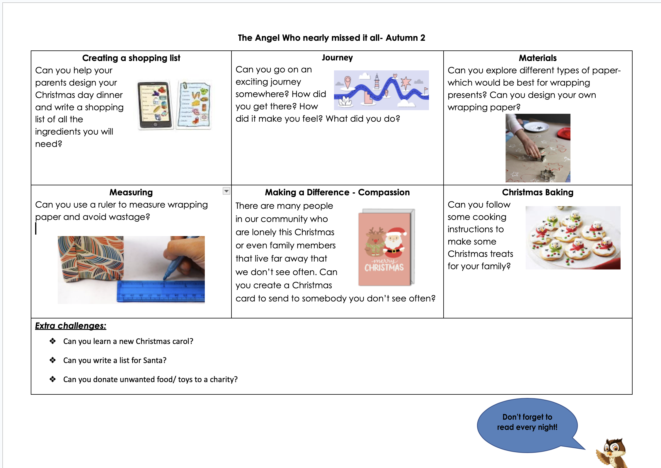 Our topic for the second part of the Autumn Term is 'The Angel who nearly missed it all'. This topic is all about exploring different materials and, of course, learning about the Christian celebration of Christmas.
