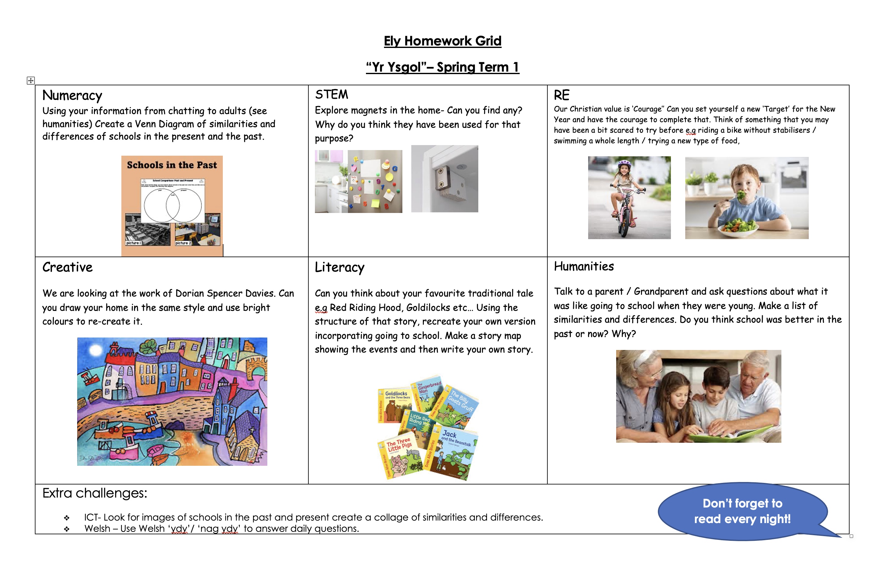 Our topic for the Spring Term  is 'Yr Ysgol'. This topic is a humanities based topic and we will look closely at Welsh history, through the topic of 'The school'. We will explore our school now, compared with schools in the past. We will look closely at how teaching and learning has changed with the use of technology and will explore how children learnt and played in the past.