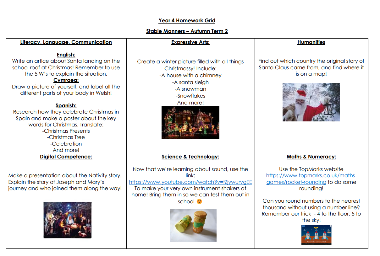 Below is a homework grid that you can use at home to complete some fun and independent activities linked to our current topic. Please don't hesitate to share any of your wonderful work with us. Diolch!
